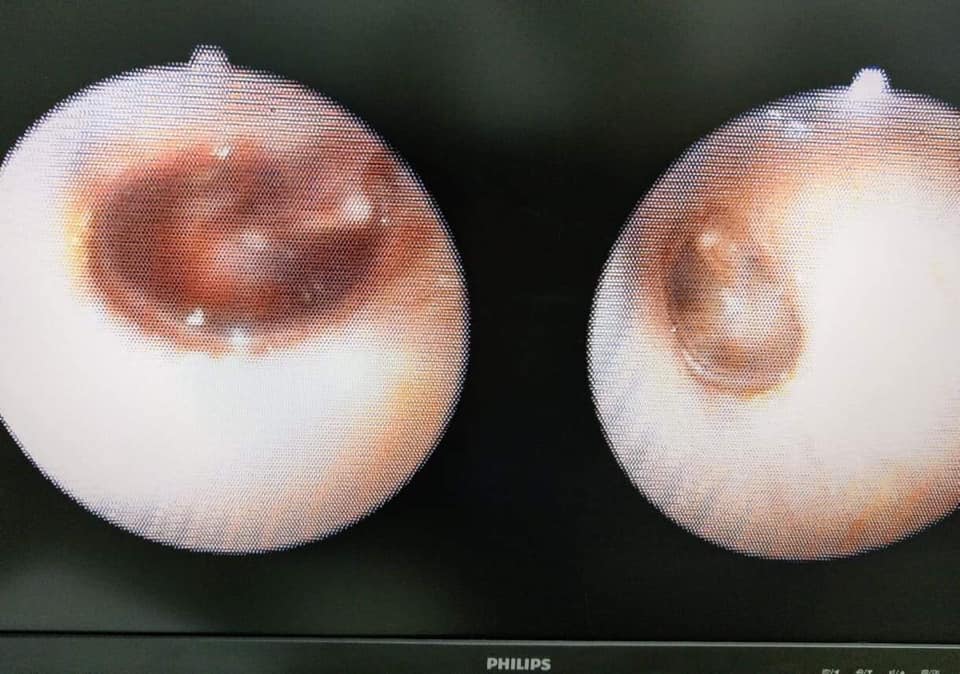 內視鏡下可見,兩耳鼓膜均有塌陷,(圖左👈)右邊鼓膜更呈現嚴重瘀血及塌陷、鼓室內有液體貯留。
