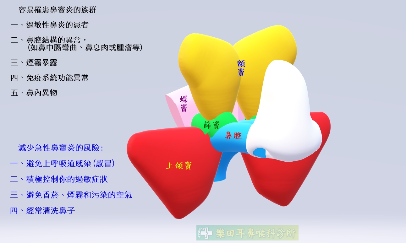 所以鼻竇炎雖然常見,但仍不能等閒視之。而什麼樣的人是容易罹患鼻竇炎的呢?首先是過敏性鼻炎的患者,再者是鼻腔結構的異常,如鼻中膈彎曲、鼻息肉或腫瘤等,另外,煙霧暴露(例如:吸煙、二手煙、空氣污染)、免疫系統功能異常,甚至有鼻內異物,都會增加鼻竇炎發生的機會。